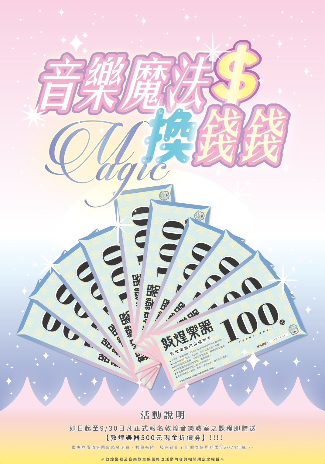 即日起至9月30日止凡正式報名任一樂器項目之課程即可獲得敦煌樂器門市商品折抵優惠券500元!